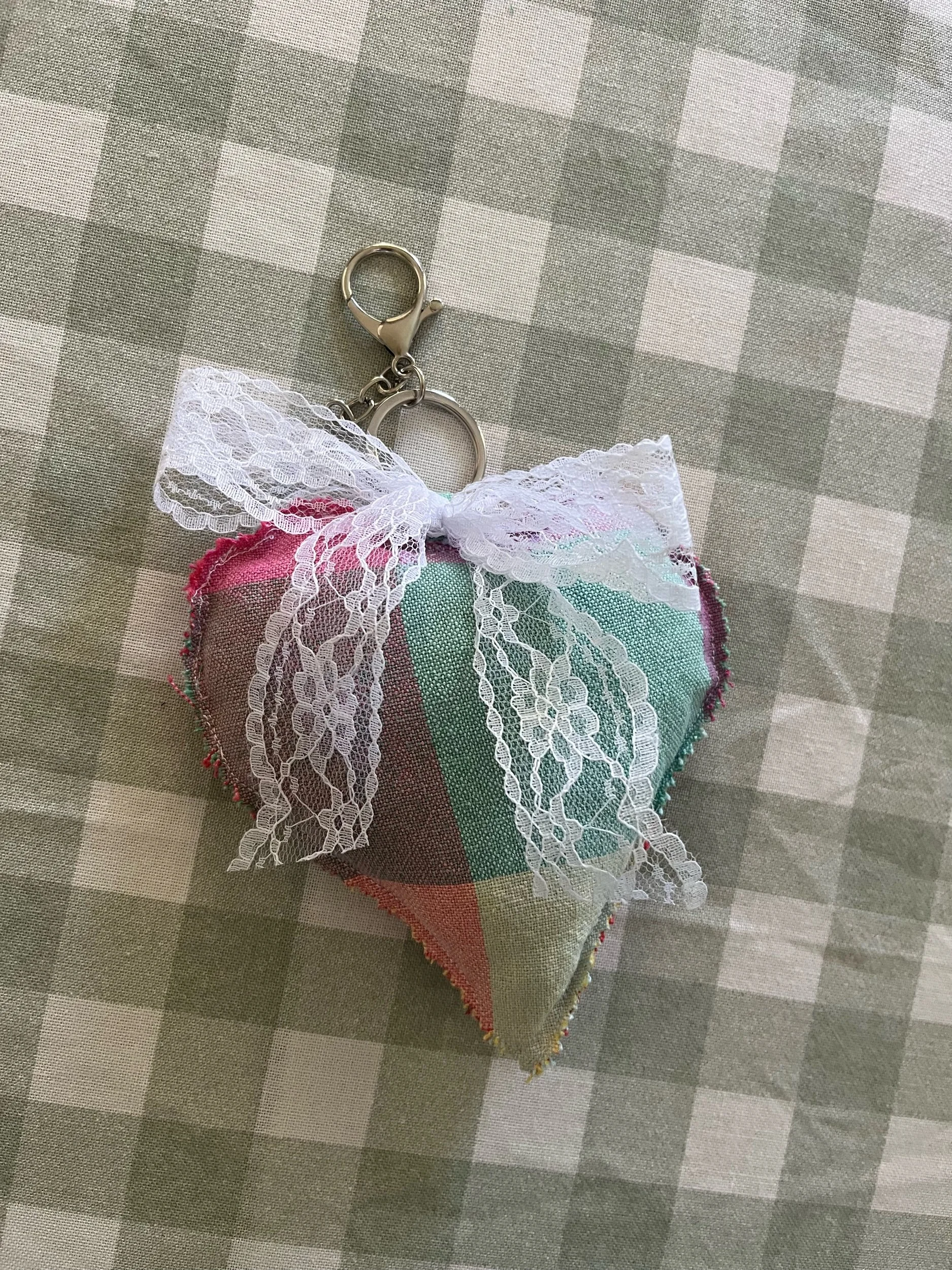 This heart-shaped charm is crafted entirely from fabric scraps, filled for a soft, puffy feel, and finished with a delicate lace bow. Each one is unique, whimsical, and sustainable! Perfect for adding a touch of love and whimsy to your bag or add to your collection of key chains!