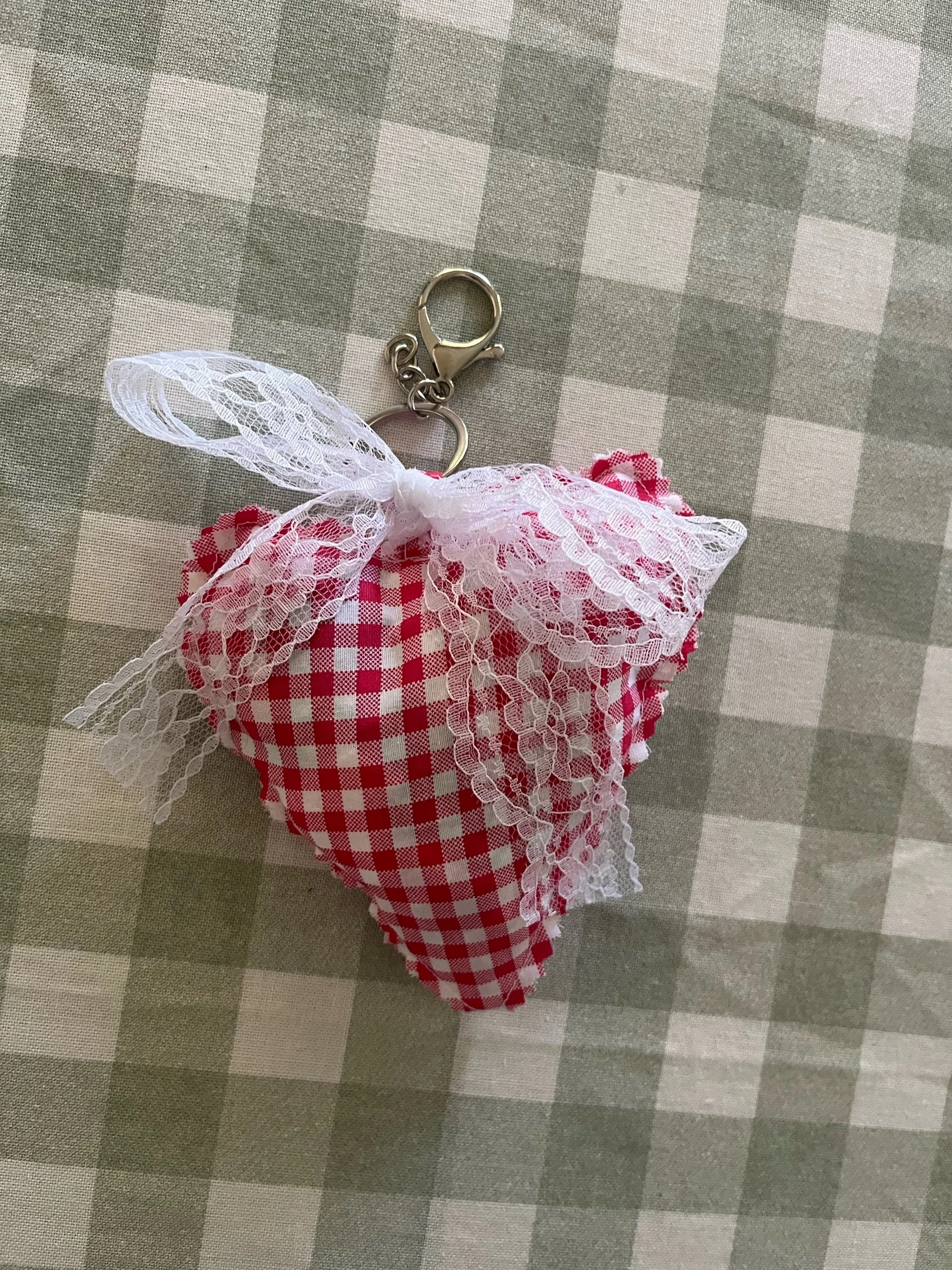 This heart-shaped charm is crafted entirely from fabric scraps, filled for a soft, puffy feel, and finished with a delicate lace bow. Each one is unique, whimsical, and sustainable! Perfect for adding a touch of love and whimsy to your bag or add to your collection of key chains!
