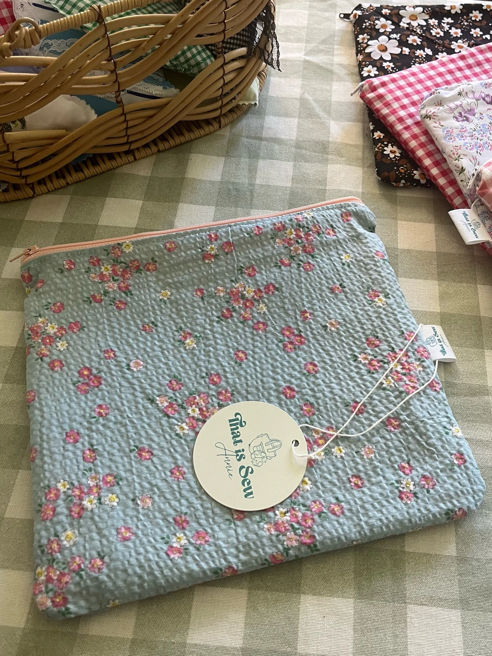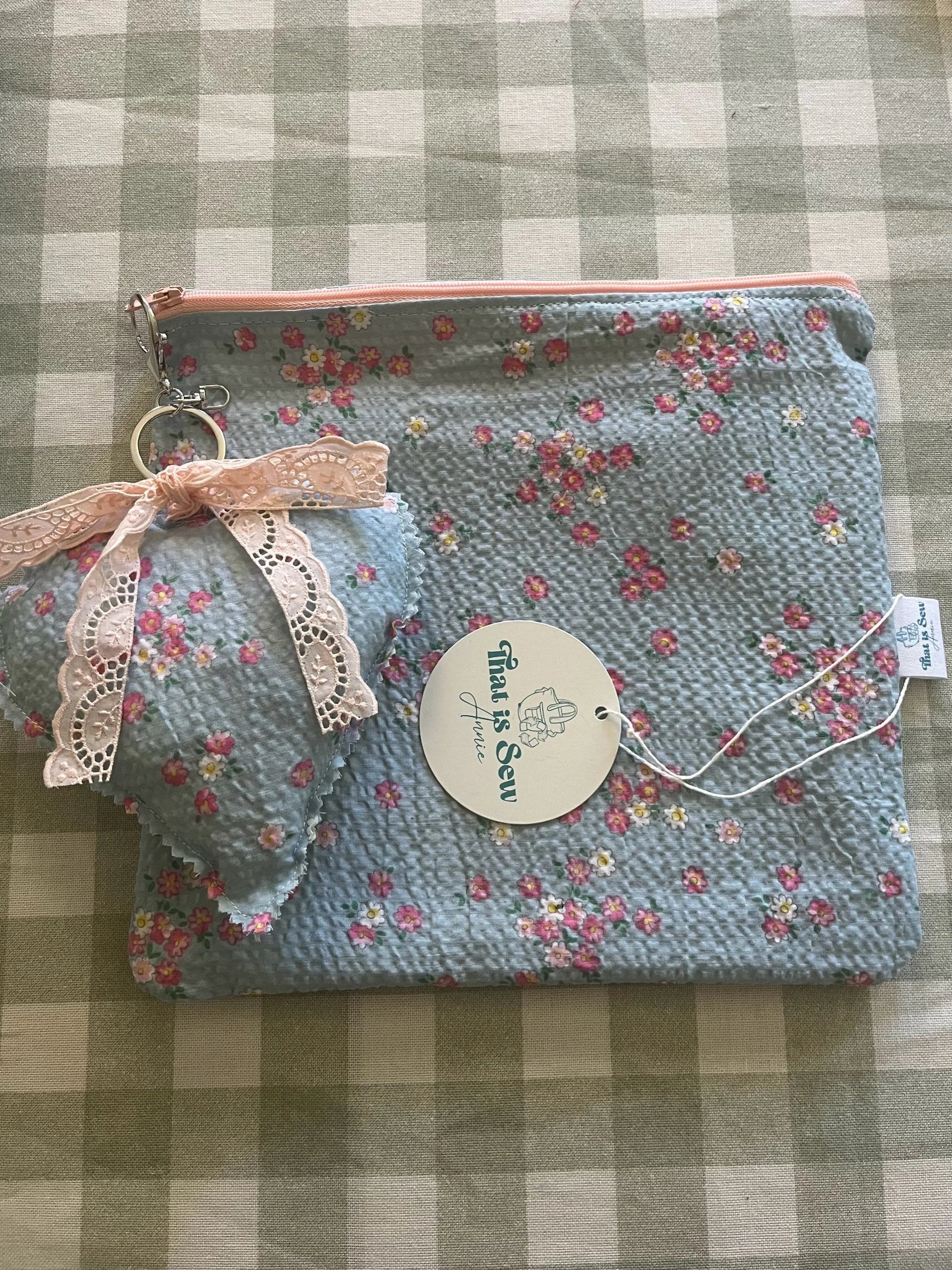 This adorable pouch is crafted from blue floral thrifted fabric offcuts and fully lined with soft pink pillowcase fabric. Perfect for your smaller everyday essentials!