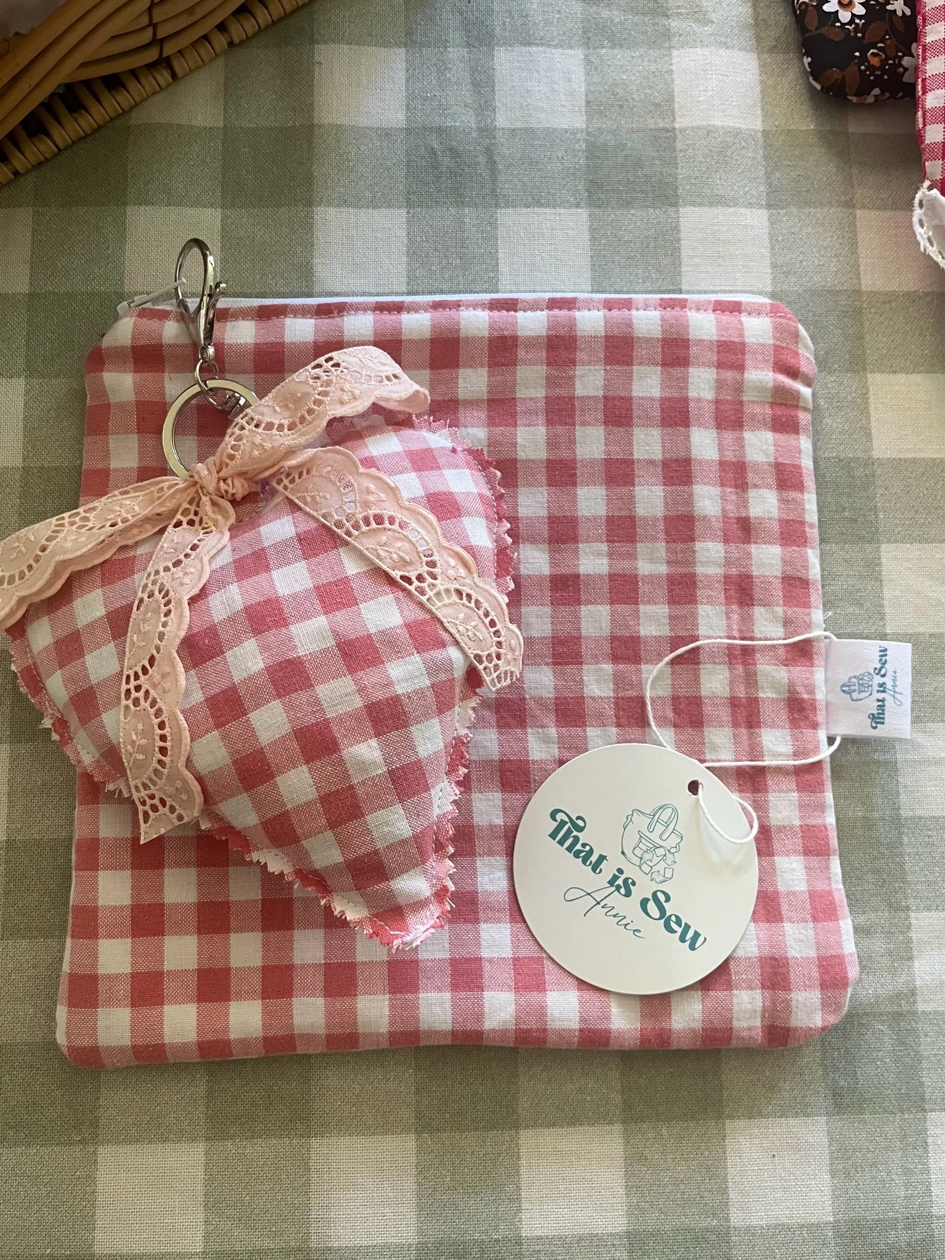 This sweet little pouch is crafted from a pink-and-white gingham tablecloth and fully lined with soft white pillowcase fabric. This cutie is perfect for your smaller everyday essentials!