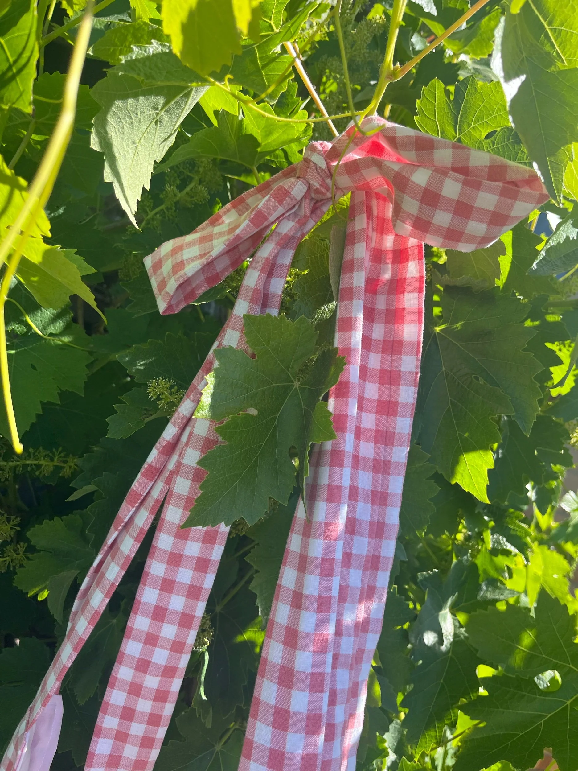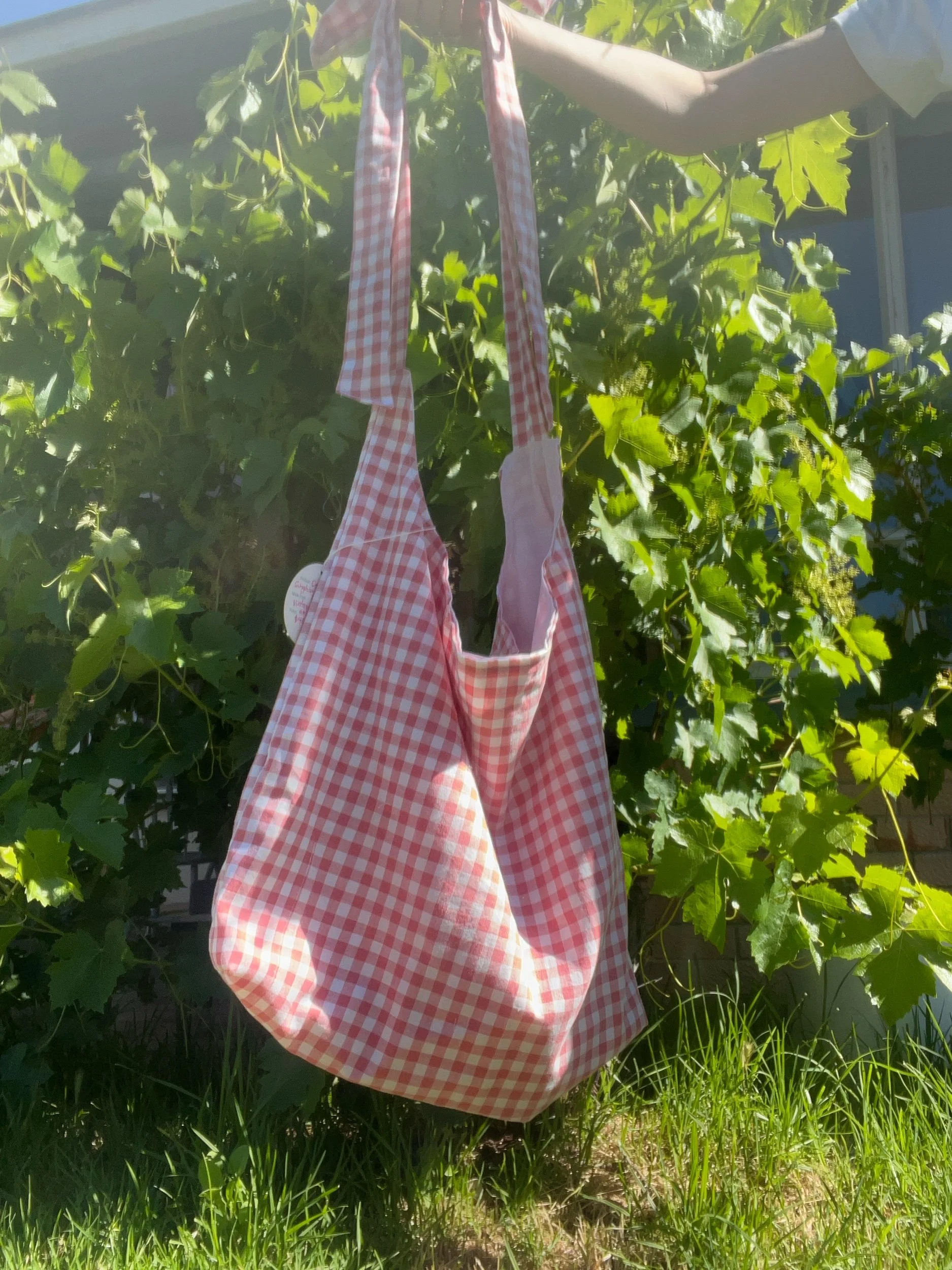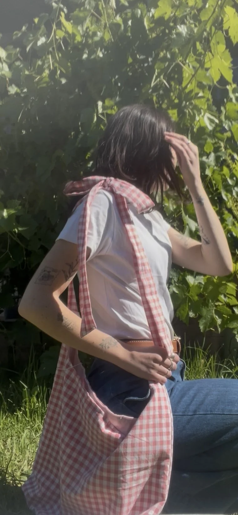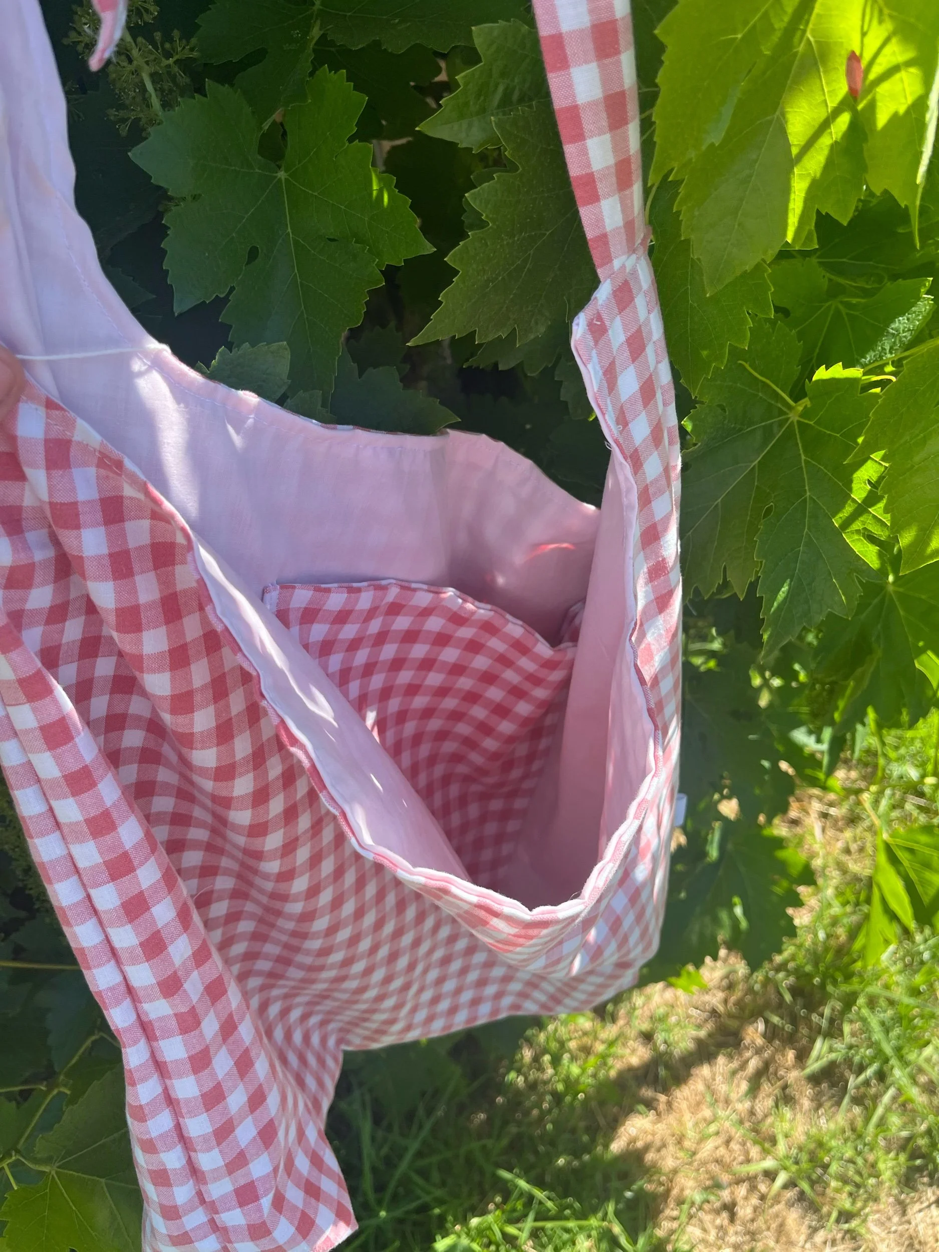 The Candy Gingham Tie up Bow Tote is made from a vintage pink and white gingham tablecloth. The adjustable tie-up straps form a sweet bow for a customizable fit and is fully lined with soft pink pillowcase fabric. A matching gingham pocket inside keeps your smaller essentials neatly separated from the rest of the bag for convenience!