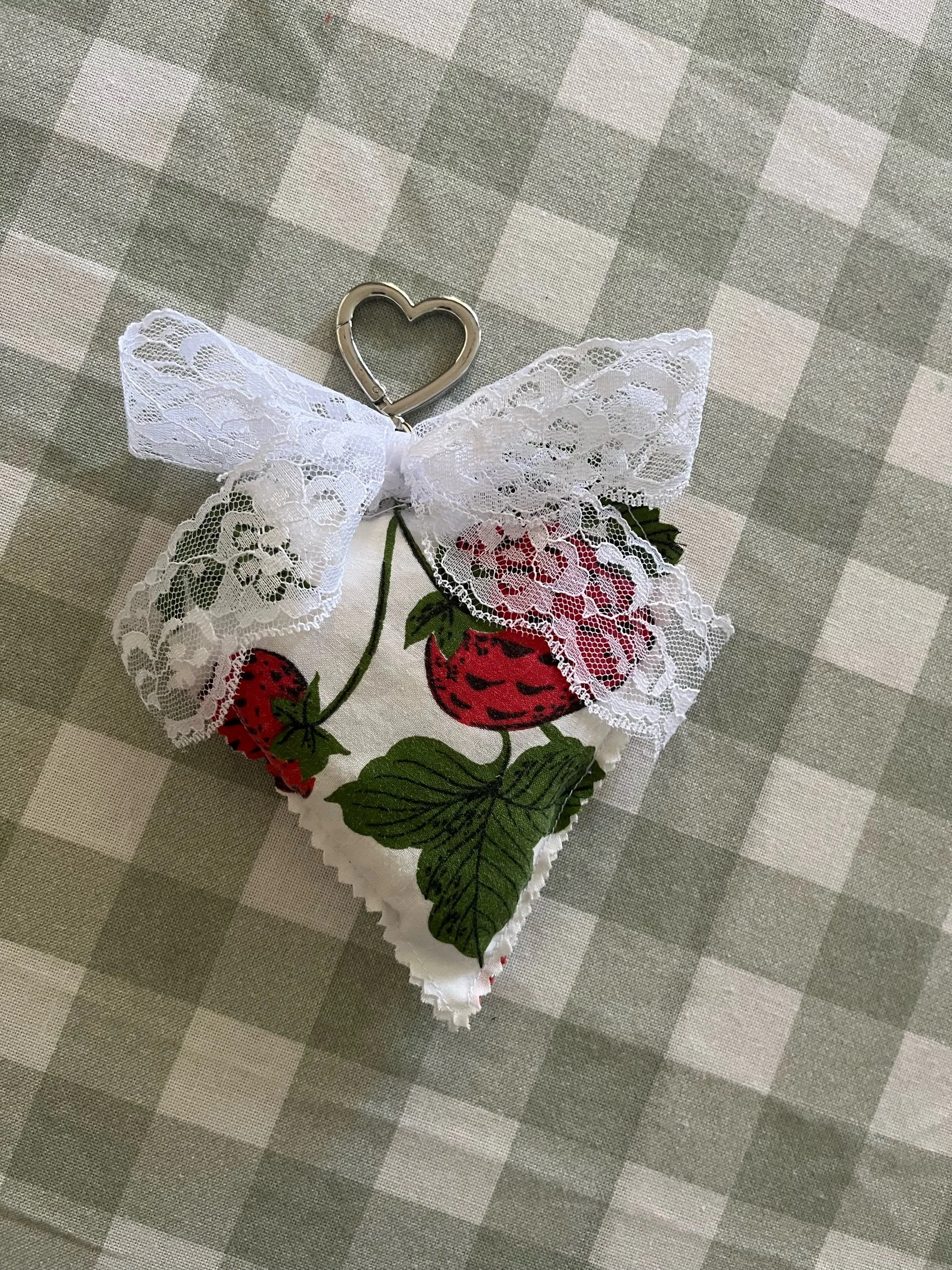 This heart-shaped charm is crafted entirely from fabric scraps, filled for a soft, puffy feel, and finished with a delicate lace bow. Each one is unique, whimsical, and sustainable! Perfect for adding a touch of love and whimsy to your bag or add to your collection of key chains!