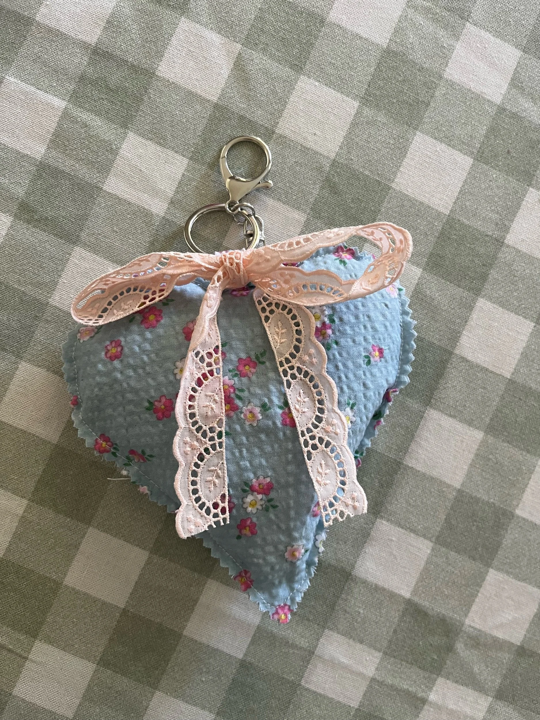 This heart-shaped charm is crafted entirely from fabric scraps, filled for a soft, puffy feel, and finished with a delicate lace bow. Each one is unique, whimsical, and sustainable! Perfect for adding a touch of love and whimsy to your bag or add to your collection of key chains!