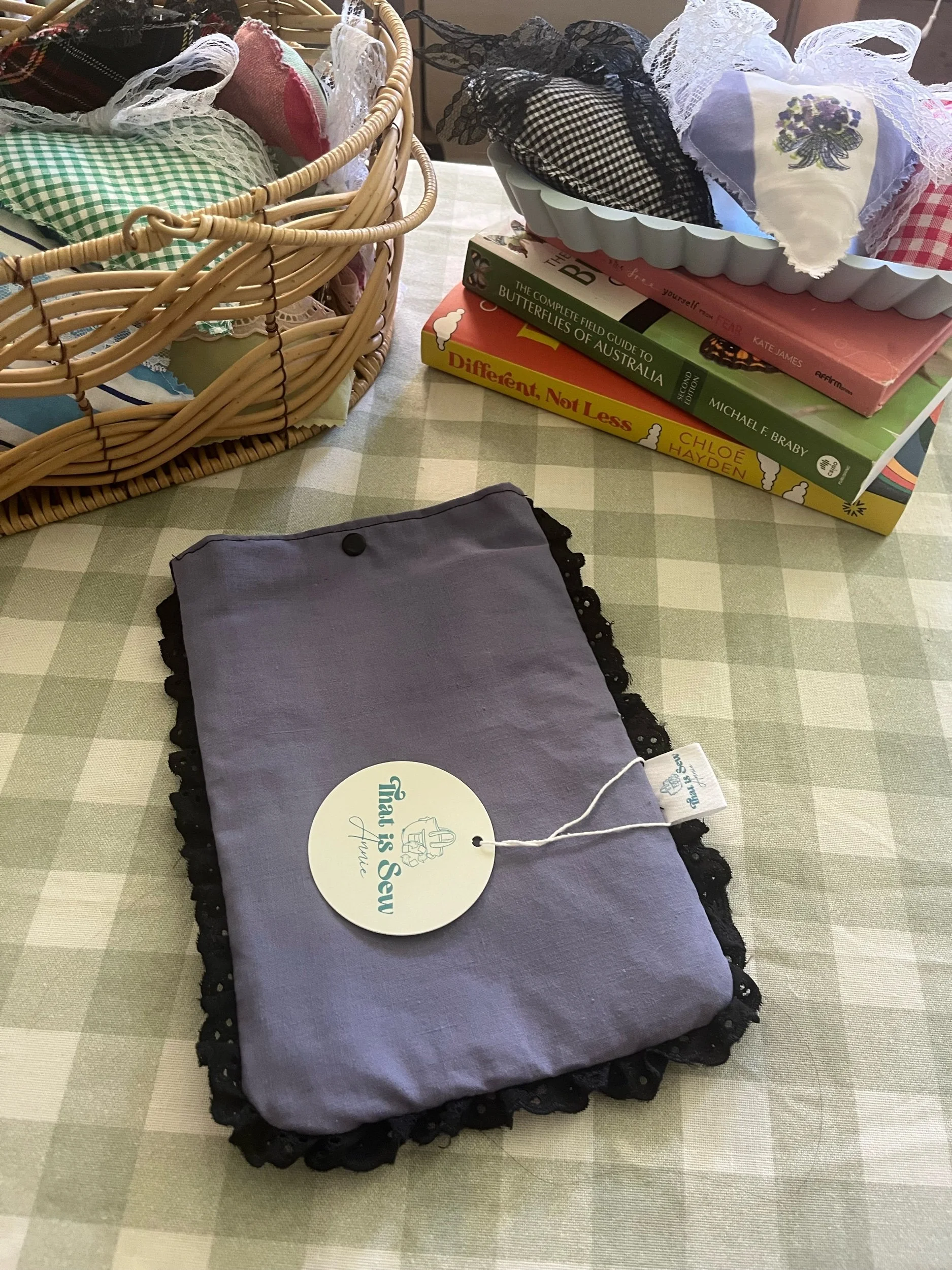 Each sleeve is one-of-a-kind, upcycled from op-shop finds, making it as unique as you are! Keep your books protected and your style sustainableđź’•