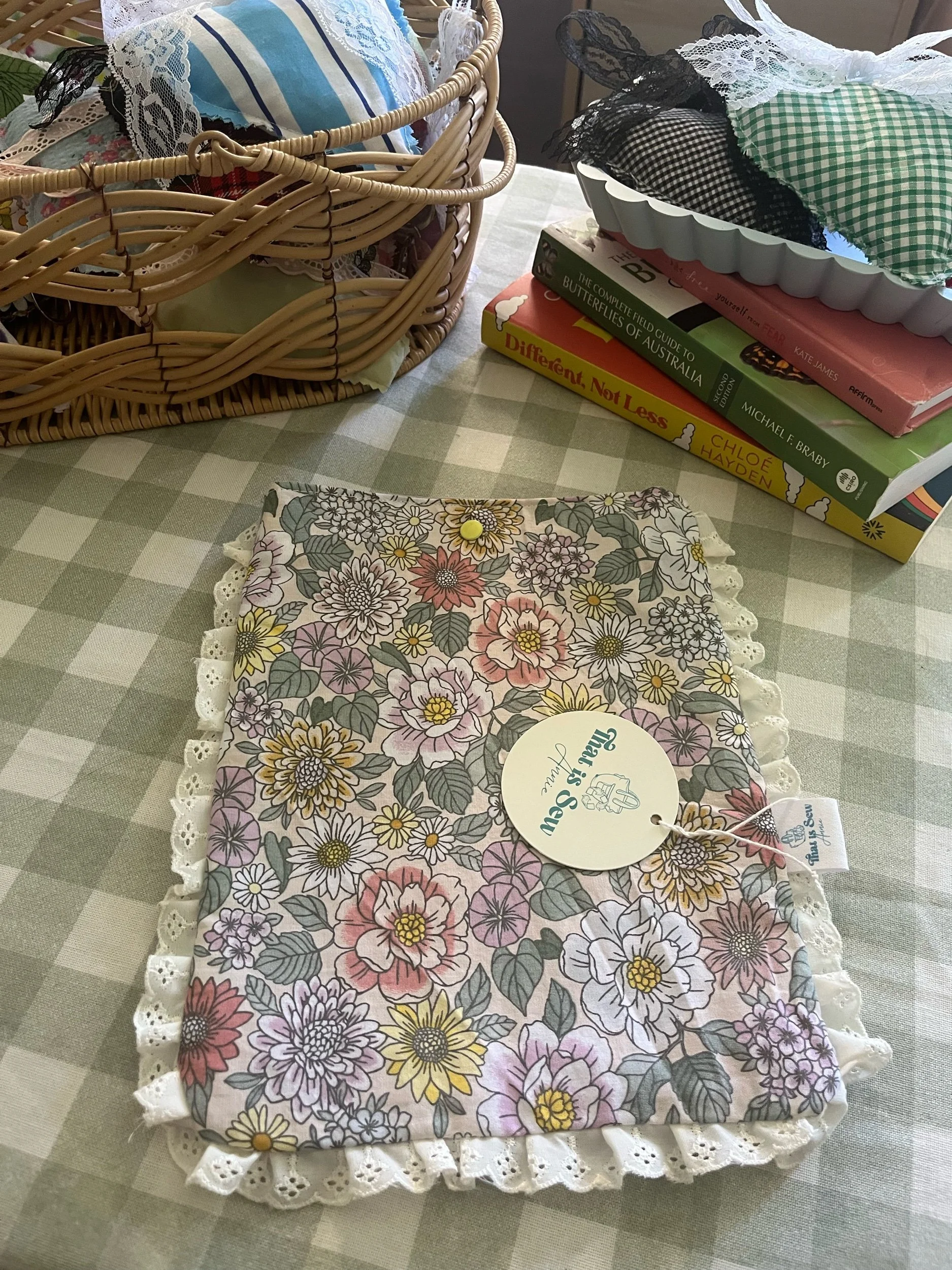 Made from colorful floral bedsheets with a white lace border and soft pink pillowcase lining. Bright, delicate, and perfect for keeping your reads protected in bloom-inspired style 🌸
